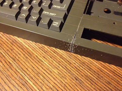 I used a "Japanese" style back saw, meant for wood cutting. I probably ruined the blade but it had seen its best days anyway. This saw took to the plastic surprisingly well, and I felt encouraged to just push violently through the screw holders and other protrusions. However as I progressed I realised the casing would loose most of its support at the same time, and the part remaining to the right side of the keyboard became quite fragile. So I did away with the protrusions with some more care, trying to saw them sideways from below when possible.